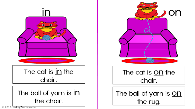 Illustrations and sentences to teach the prepositions: in, on, off, out